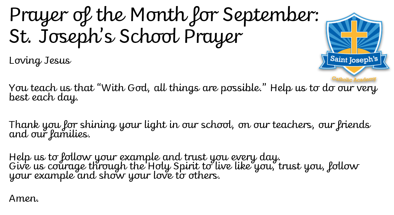 Our Catholic Life Leaders 2024 - 2025 wrote a new school prayer inspired by our mission statement, "With God, all things are possible."  We say this prayer often in our school because it reminds us that we strive to achieve the very best that we can, with the help of God.
